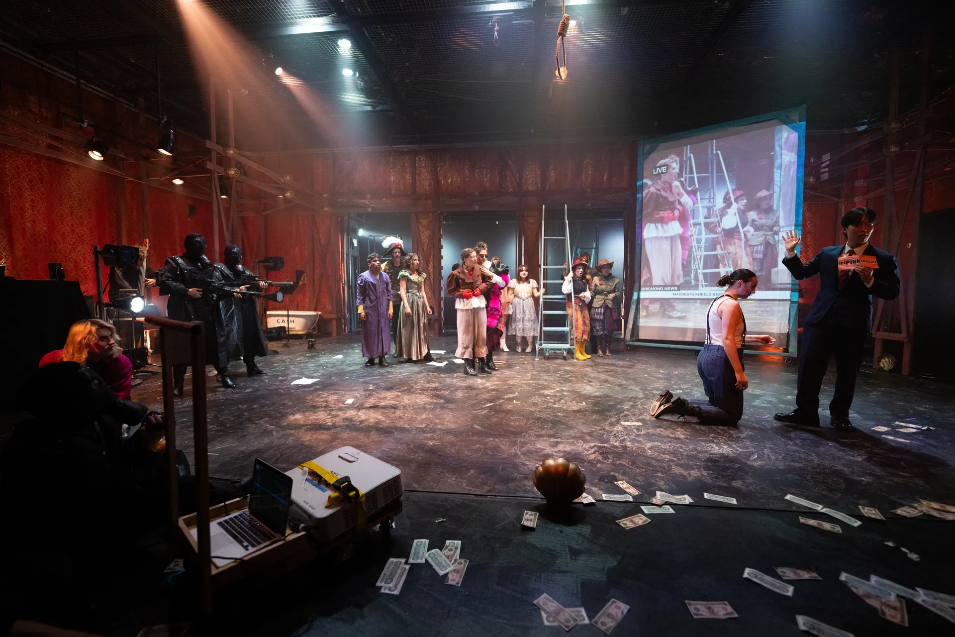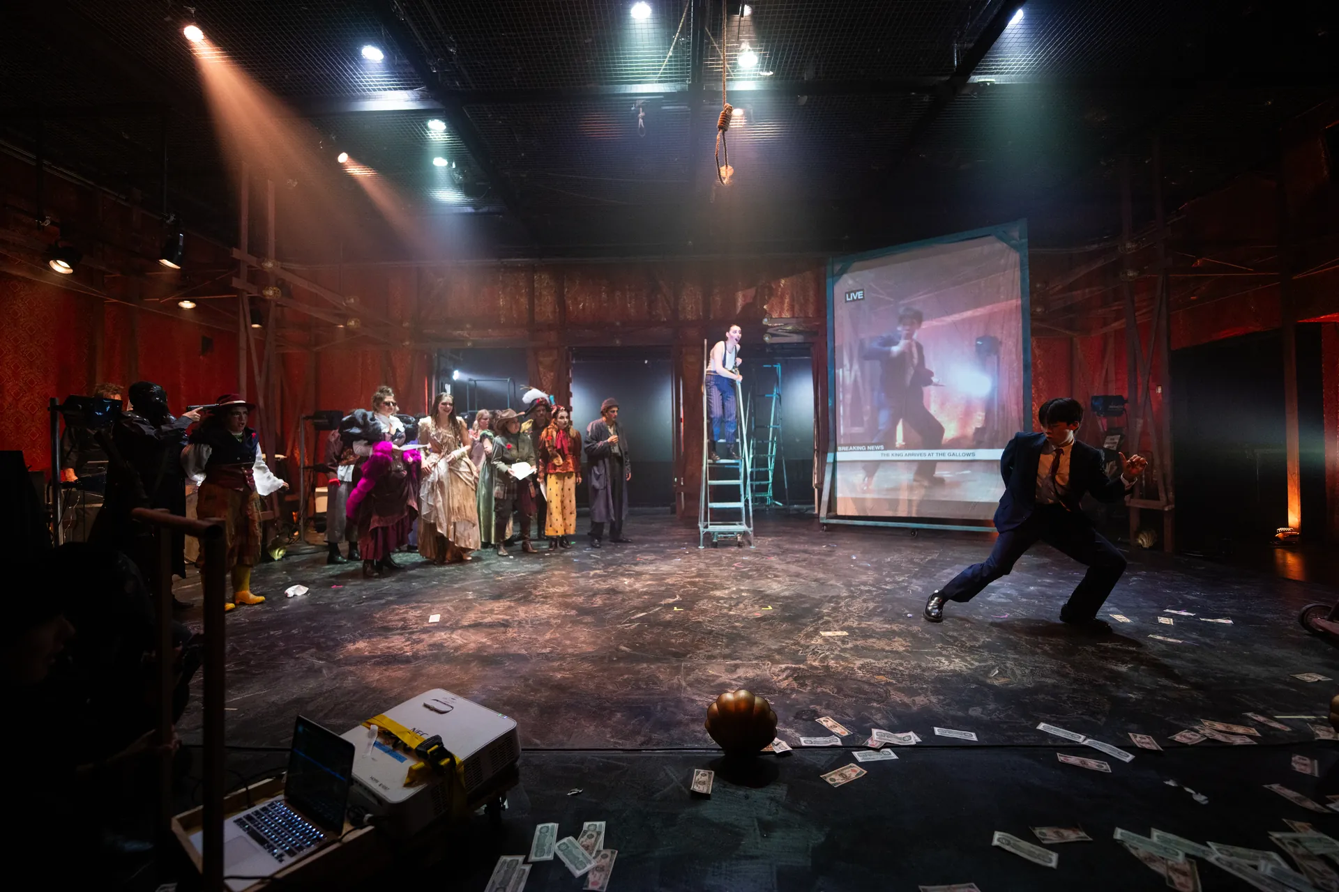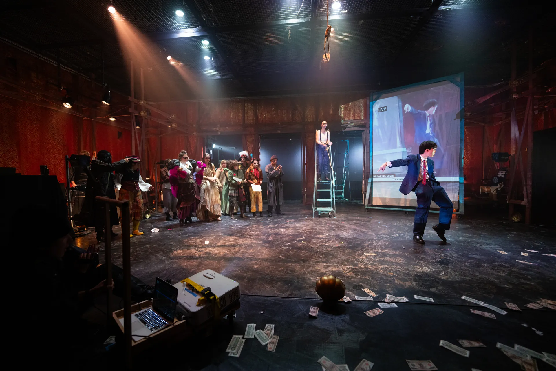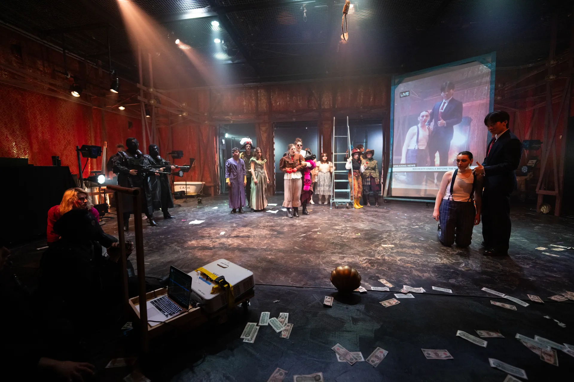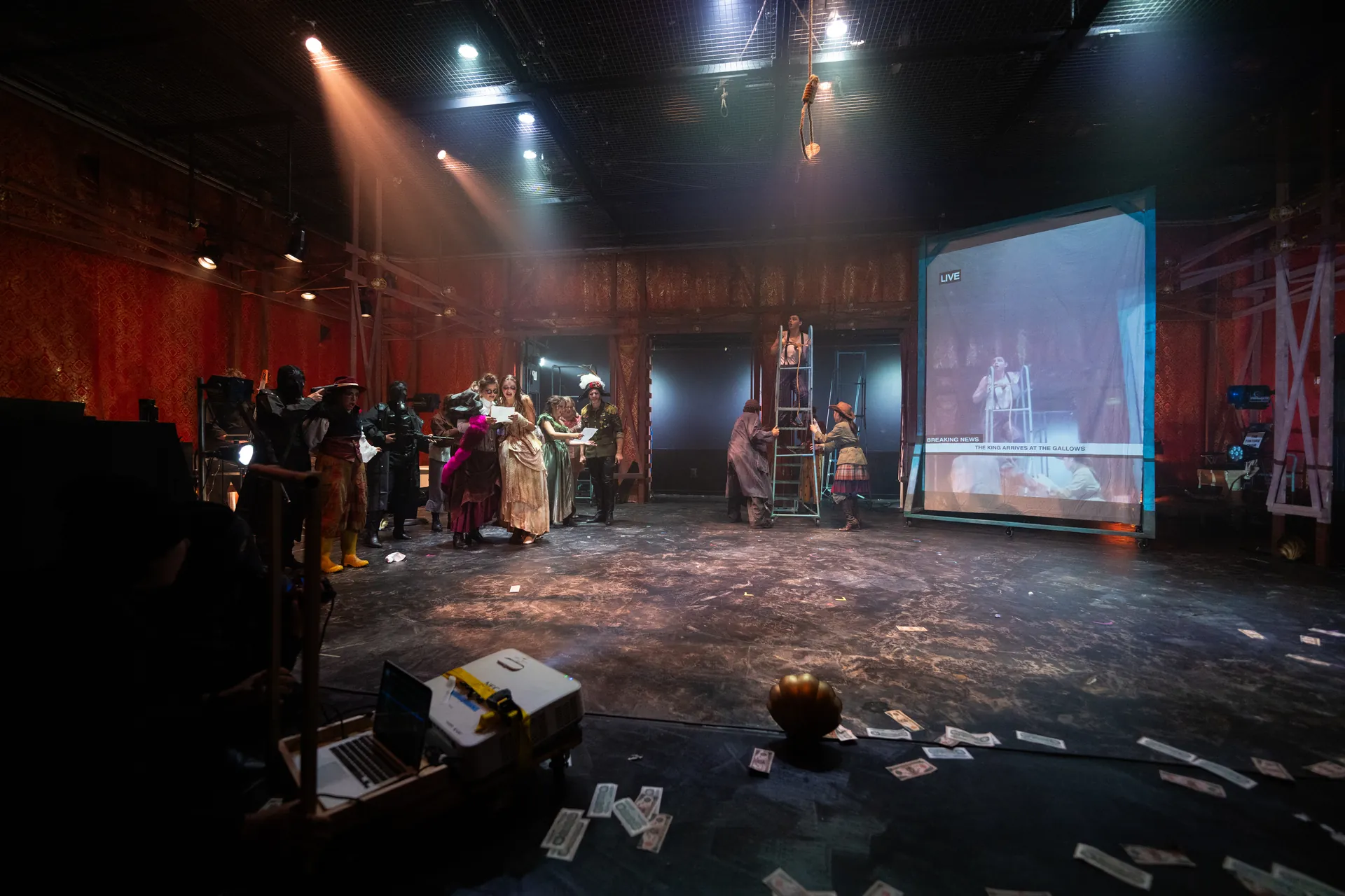 I projection designed the play The Threepenny Opera by Bertolt Brecht and directed by Annie Torsiglieri. I designed a live projection system where the actors would storm in, roll in a 7.5K laser projector on a cart, and film the scene with a camcorder. The video feed was displayed live as a newscast. I used Adobe After Effects, Adobe Photoshop, and QLab to design the projections.