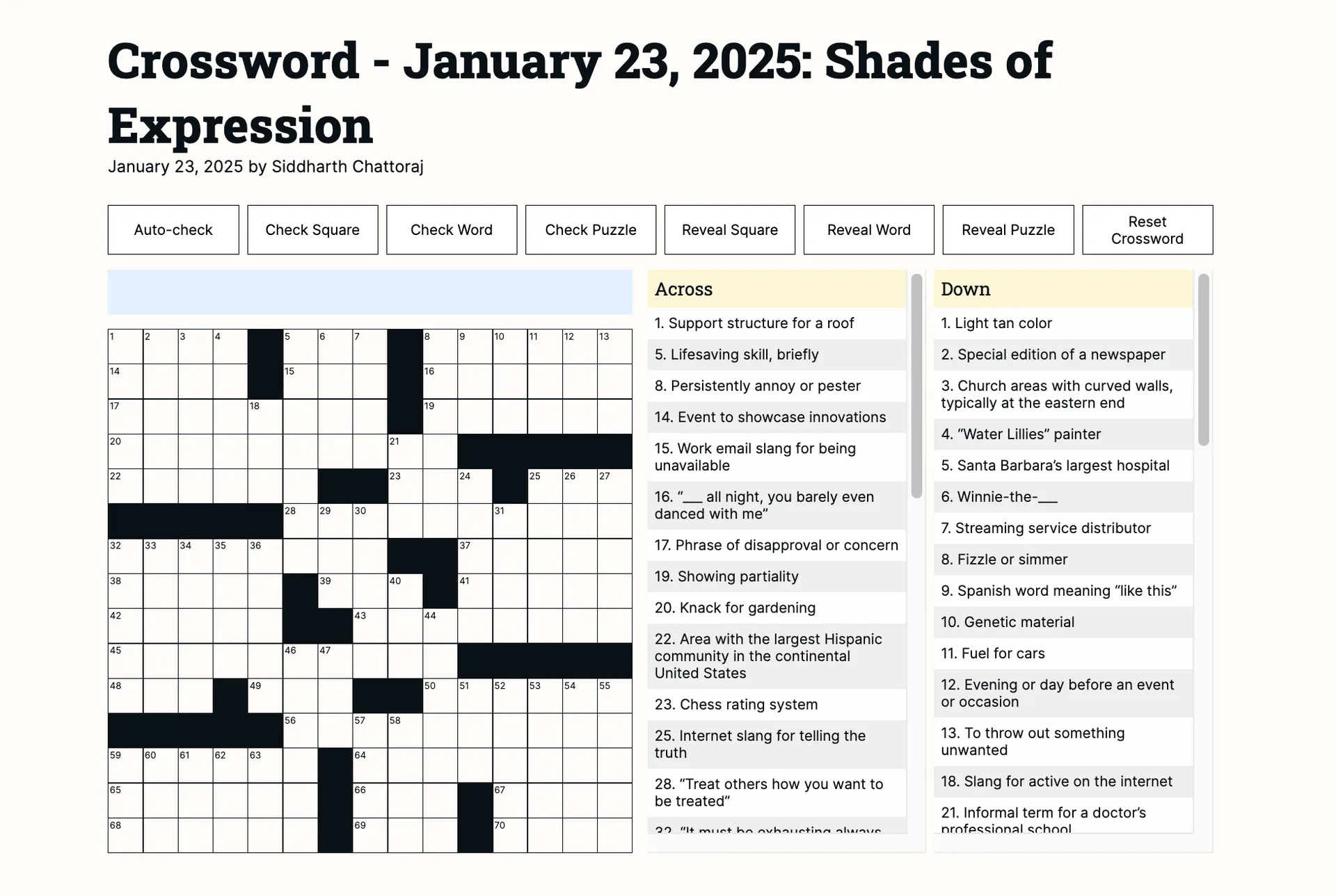 After spending a year at the Daily Nexus and witnessing the need to increase engagement with both our print and digital editions, I founded the Games section of the Nexus to create an interactive entry point for readers and bring playfulness into our coverage. I built crossword puzzles in JavaScript and published them both digitally and in print as weekly features tied to campus life and our editorial calendar. To grow Games further and expand the types of games offered, I hired the Games Developer/Editor and project managed the creation of the Daily Nexus Games website—one of the first full-fledged collegiate newspaper platforms dedicated to original, student-built games.