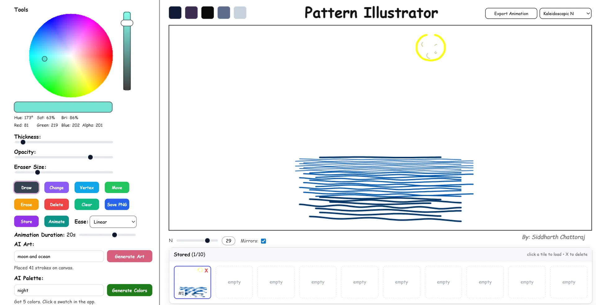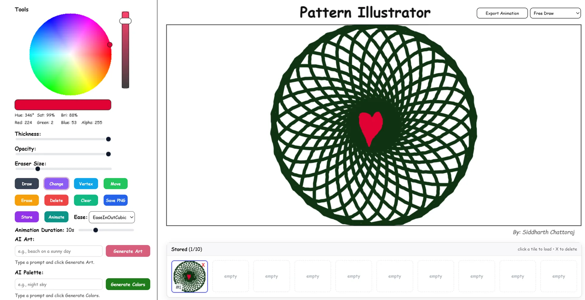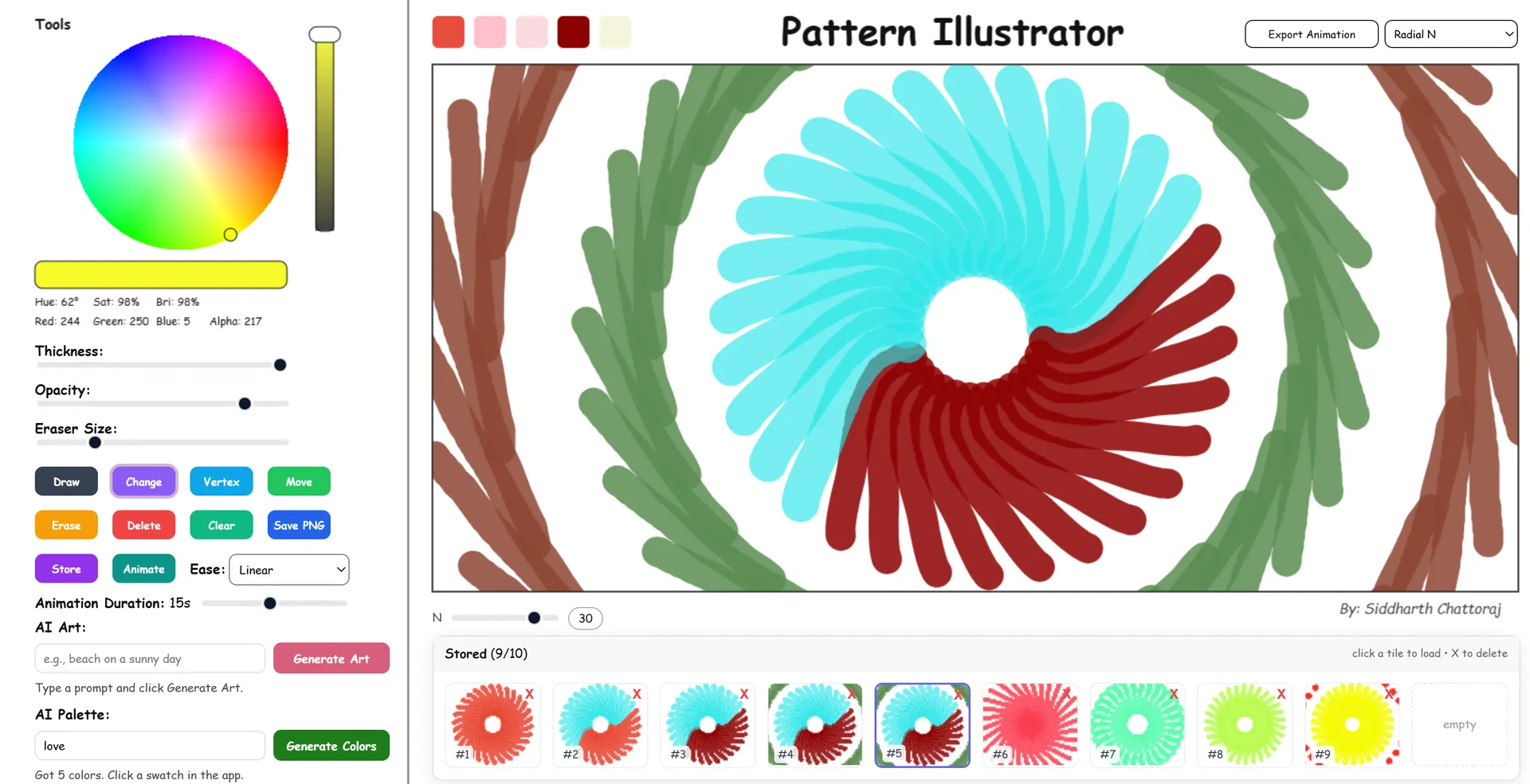 Pattern Illustrator is a drawing and animation tool that enables users to directly and efficiently design pattern drawings, or they can generate directly modifiable sketches with Gemini. Each illustration is built from a series of strokes, and the user can directly modify these strokes to improve the overall aesthetic of the drawing. The tool provides the ability to visualize an animation between up to ten illustrations stored within the platform, using linear interpolation to create smooth transitions. The idea for a drawing tool that could simultaneously provide the ability to animate originated from my experience creating animations for dance shows, where it was very difficult to prototype and design animations when I first started without any experience. My goal with Pattern Illustrator is to encourage beginner illustrators to find meaning from and create expression out of patterns, especially within the nuances of structured forms.
